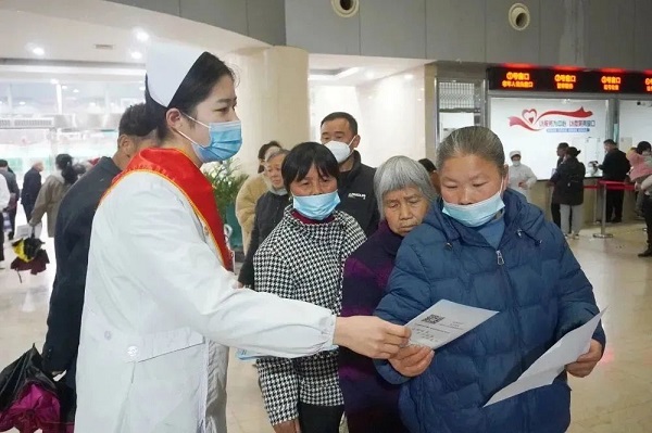 医务人员正在为患者免费测量视力、眼压、血压、血糖