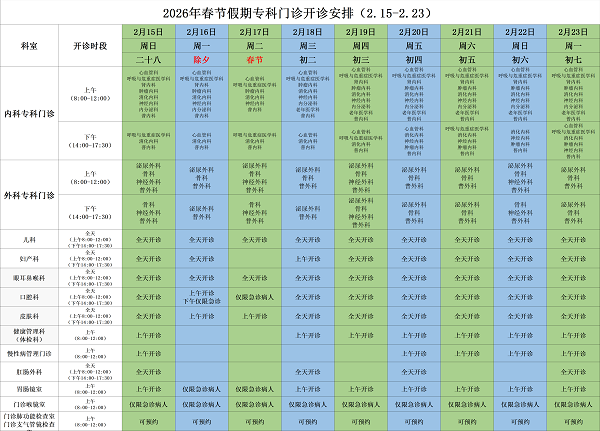 春节期间门诊开诊安排(2.15-2.23)